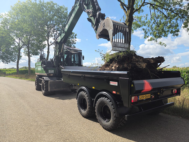 Wat deze trailer speciaal maakt is dat hij is ontwikkeld om achter een mobiele graafmachine te koppelen.